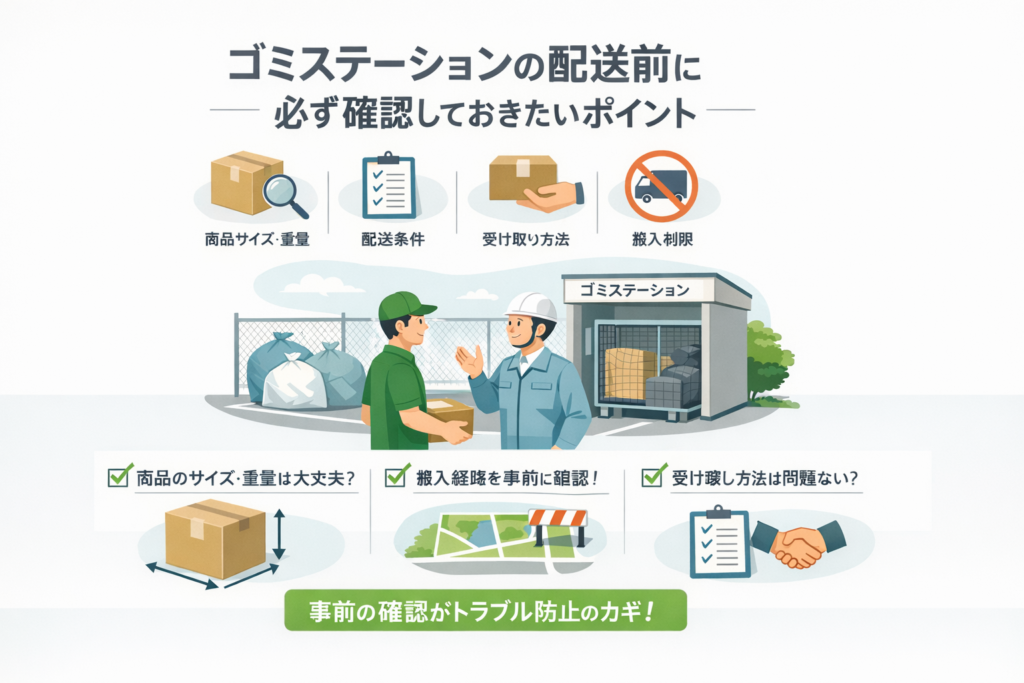 スムーズな納品やトラブル防止のためにも、購入前に配送条件をしっかり確認しておくことが重要です。ここでは、ゴミステーションの配送前に必ずおさえておきたい確認事項の一部をご紹介します。