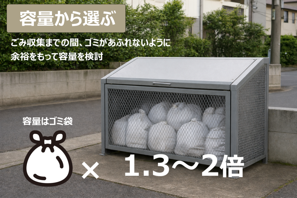 また、長期連休などのごみ収集の回数が減る時期などを考慮し、余力を持った容量設定を行うケースも多いと思われます。その際は想定袋数の2倍程度の寸法容量を持つゴミステーションを選ぶとよいでしょう。